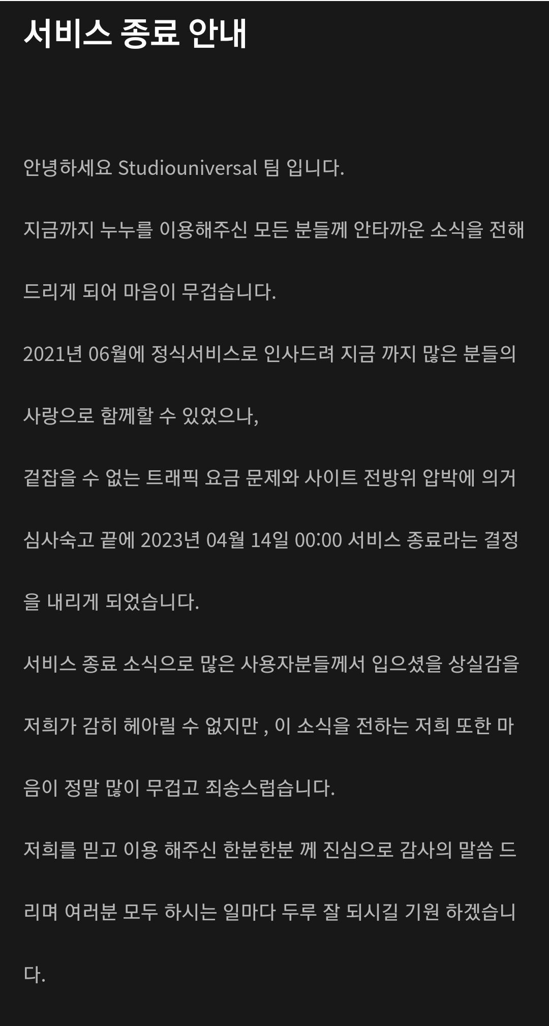 13일 공지사항에 많은 트래픽 요금 문제와 압박으로 서비스를 종료한다는 공지사항이 올라왔습니다.